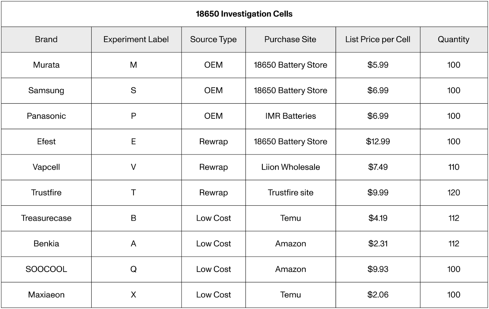 I ordered at least 100 cells from each of 10 brands, ending up with 1,054 cells total, given purchase increment minimums and free extras received. Every cell was scanned. Three sets came from the well-known OEMs—Murata, Samsung, and Panasonic—sourced from reputable online stores specializing in 18650 batteries. Three sets came from the rewrap brands Efest, Vapcell, and Trustfire, with Efest and Vapcell coming from reputable 18650 online storefronts, and the Trustfire cells coming from their brand website. The final four were more suspicious. I chose three of the brands for being lower cost: Treasurecase and Maxiaeon came from Temu, Benkia from Amazon. The SOOCOOL cells were not cheap, but were advertised on Amazon as “authentic” Samsung 30Q cells, their wraps closely but not perfectly mimicking the aesthetic of the genuine Samsung cells.