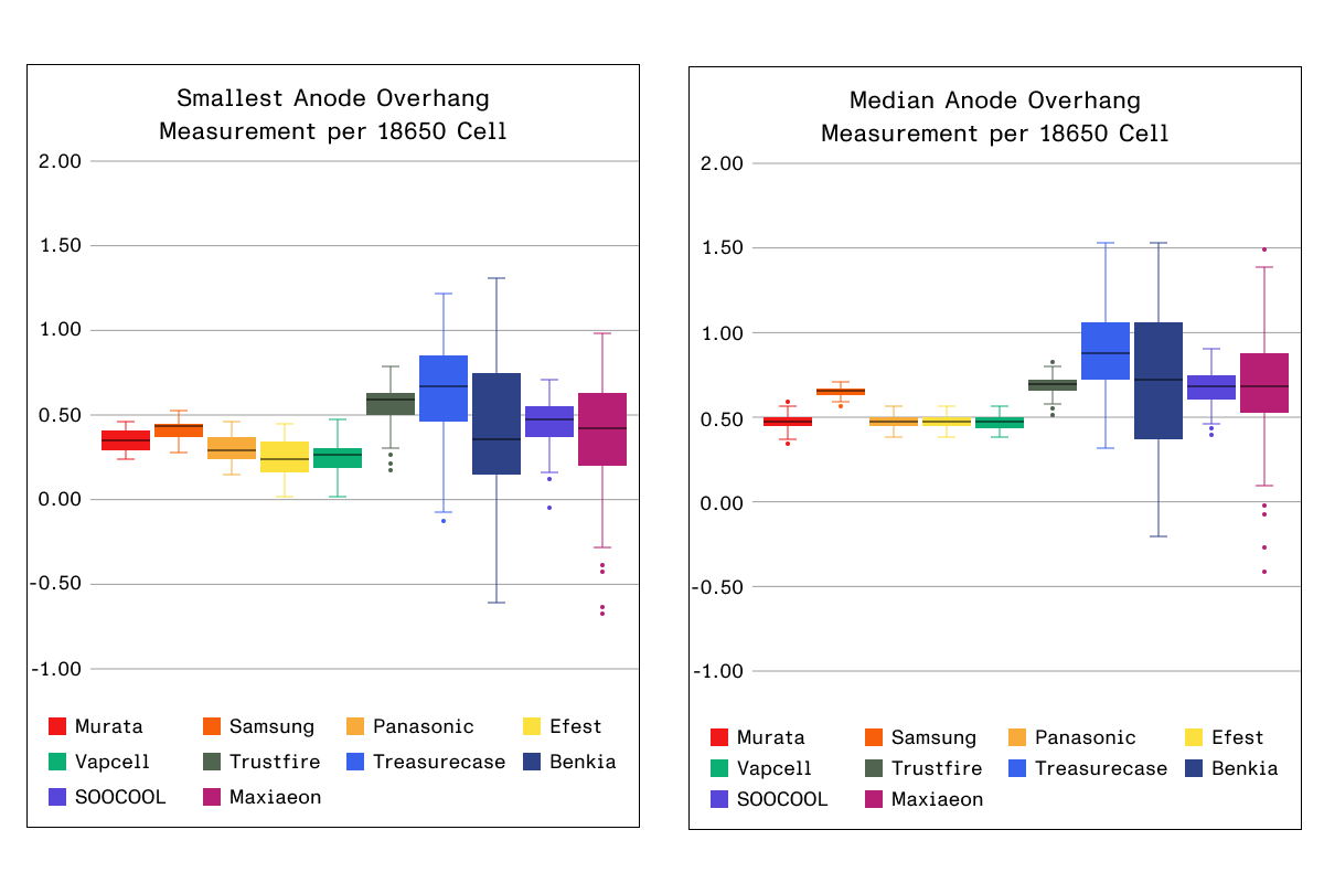 The results aligned generally with our expectations, but the degree of difference was surprising. OEM cells showed tight control, with anode overhang centered near the 0.50 mm industry average and modest telescoping. The rewraps generally matched the OEM medians quite closely, though their spreads were wider, and the minimum overhang tails in particular stretched lower. Trustfire stood apart from Efest and Vapcell with a significantly worse distribution, a reminder that rewraps are blind boxes that carry real risk. Unless you scan and measure what you buy, you cannot be sure what exactly is hiding under the sleeve.