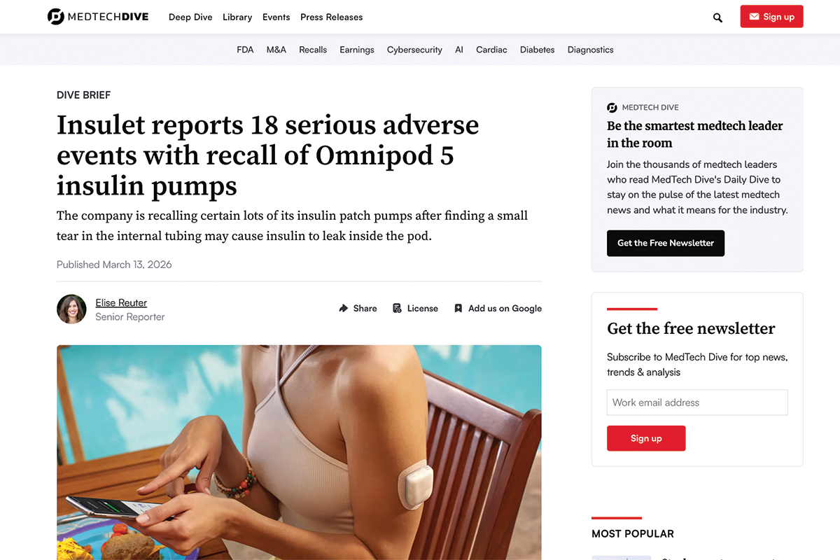 Everyday medical devices have also seen a recall this month. Certain Insulet Omnipod 5 Pod lots contain a small tear in the internal insulin delivery tubing. This defect is small enough that nothing about the pod's external appearance or initial behavior signals a problem. However, as a result insulin leaks inside the device rather than reaching the patient, and the user may not know anything has gone wrong until glucose levels have already climbed to dangerous levels or a hazard alarm finally triggers. In the worst cases, the outcome is diabetic ketoacidosis, a condition that can escalate quickly if insulin delivery has silently failed for hours. Eighteen serious injuries had been reported as of March 12.