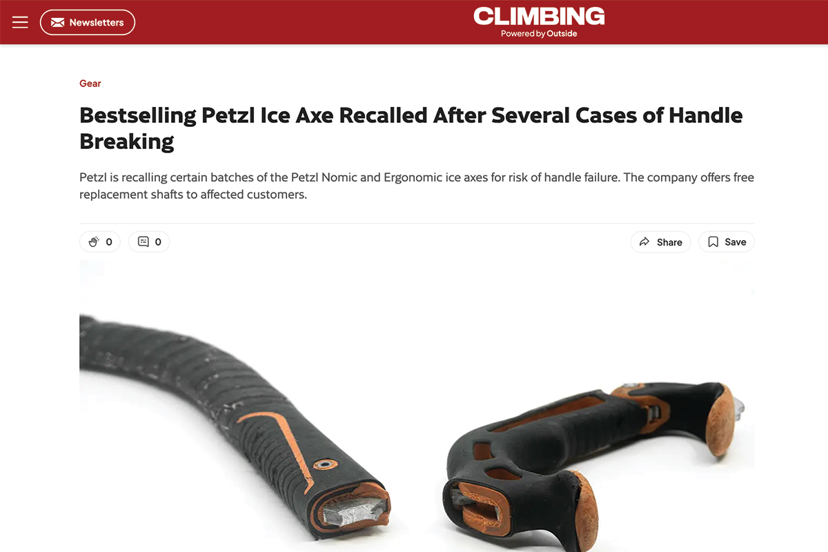 Petzl's recall of approximately 4,200 Nomic and Ergonomic ice climbing axes, with another 1,160 units sold in Canada, involves the shaft breaking at the handle during use. The serial number on each axe identifies whether it's affected. The stakes are different from the bicycle fork or the office chair. In ice climbing the axe is a primary anchor, and a shaft failure mid-climb is a fall. Petzl is offering a repair remedy. Like the bicycle fork and the office chair, this is a structural component that failed under the load it was built to carry.