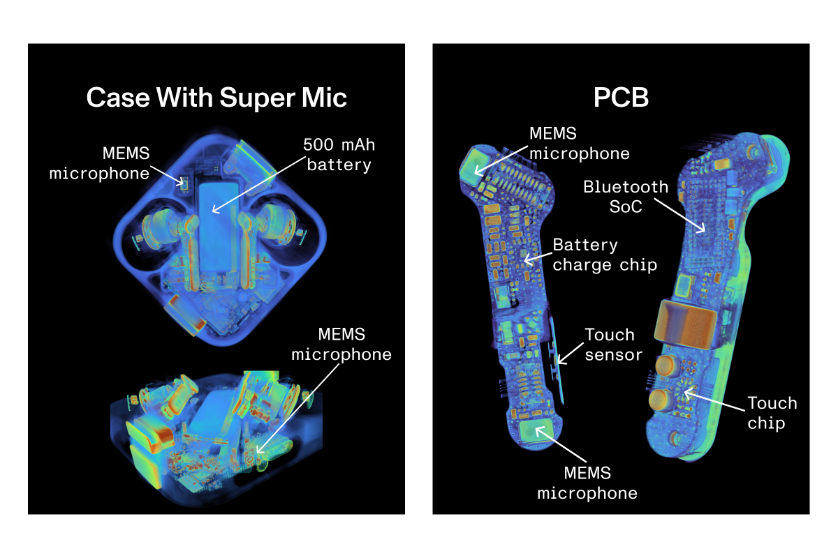 The charging case carries a 500mAh battery, enough for multiple full recharges of both earbuds. The case scan also shows the Super Mic: a dual-MEMS microphone array built into the case itself, designed to function as a standalone microphone. The two MEMS microphones are visible as distinct components separate from the charging circuitry.