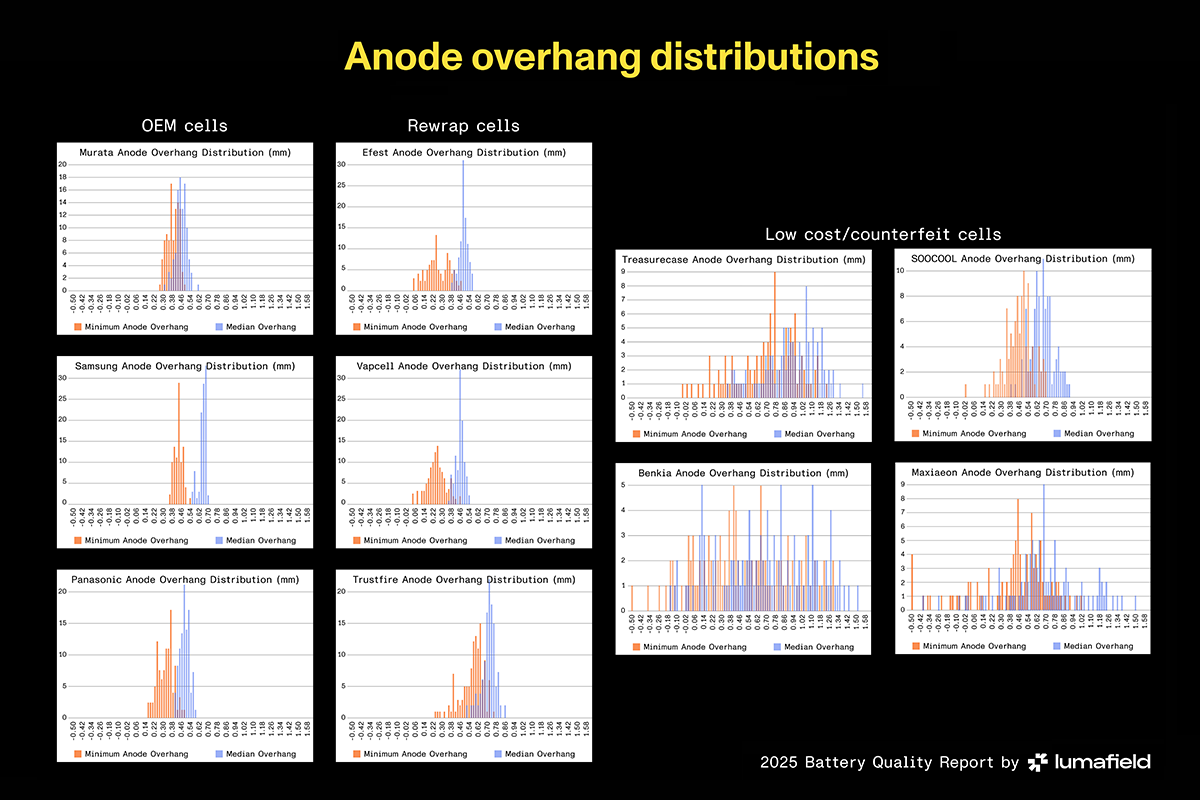 Separate from these two groups are rewrapped batteries. In most cases they begin as legitimate OEM cells that have been relabeled for distribution under a new brand. Many perform as expected because the core cell was designed and built by a competent manufacturer. But risk comes from uncertainty about the exact source. Rewraps can include surplus lots, cells that failed OEM QA, or units that were disassembled from larger salvaged battery packs. The new wrap hides that history, so the question becomes not whether rewraps are inherently poor, but whether any given batch matches the underlying standard. In our scans, several rewraps generally mirrored mainstream OEM geometry, though the anode overhang distributions were not as tight. One of the three rewrap brands we scanned was also markedly worse than the other two, illustrating the variability rewrapping can hide, though even the worst rewrap cells were still much higher quality than the low-cost/counterfeit cells.