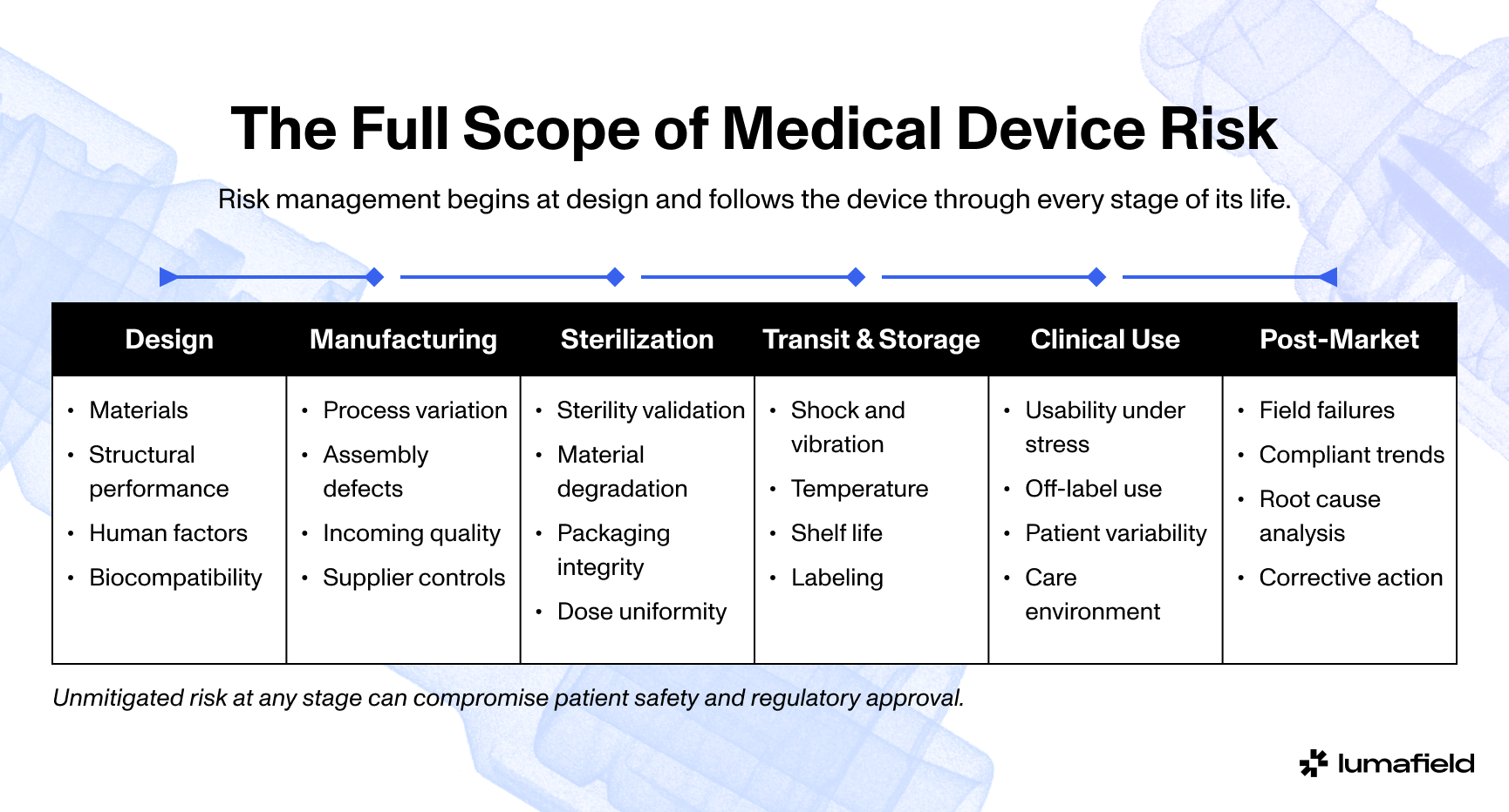 Risk does not start or end at the manufacturing floor. Under QMSR, teams are expected to trace and mitigate it across every stage shown here, from the first design decision to the last field return.