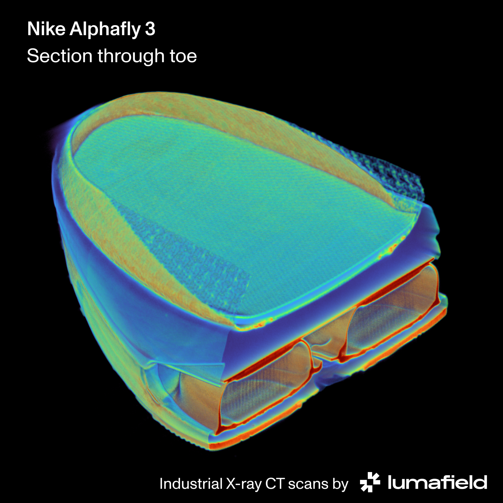 Every major brand has since developed its own version of the super shoe. To understand what separates the leading models, Lumafield worked with the Financial Times visual storytelling team to CT scan two of them: the Nike Alphafly 3 and the Adidas Adizero Adios Pro Evo 1. The FT used the scans as the evidential foundation for a reported investigation into the technology driving record-breaking marathon performance. What follows is a detailed account of what the scans revealed.