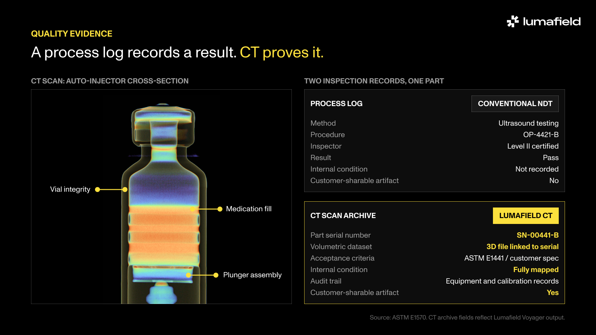 A CT scan archive tied to part serialization satisfies prime contractor and regulatory audit requirements that process logs cannot meet. ASTM E1570 explicitly supports CT examination being specified on engineering drawings and contracts. The scan record is permanent, customer-sharable, and functions as volumetric evidence of actual part condition at time of manufacture.