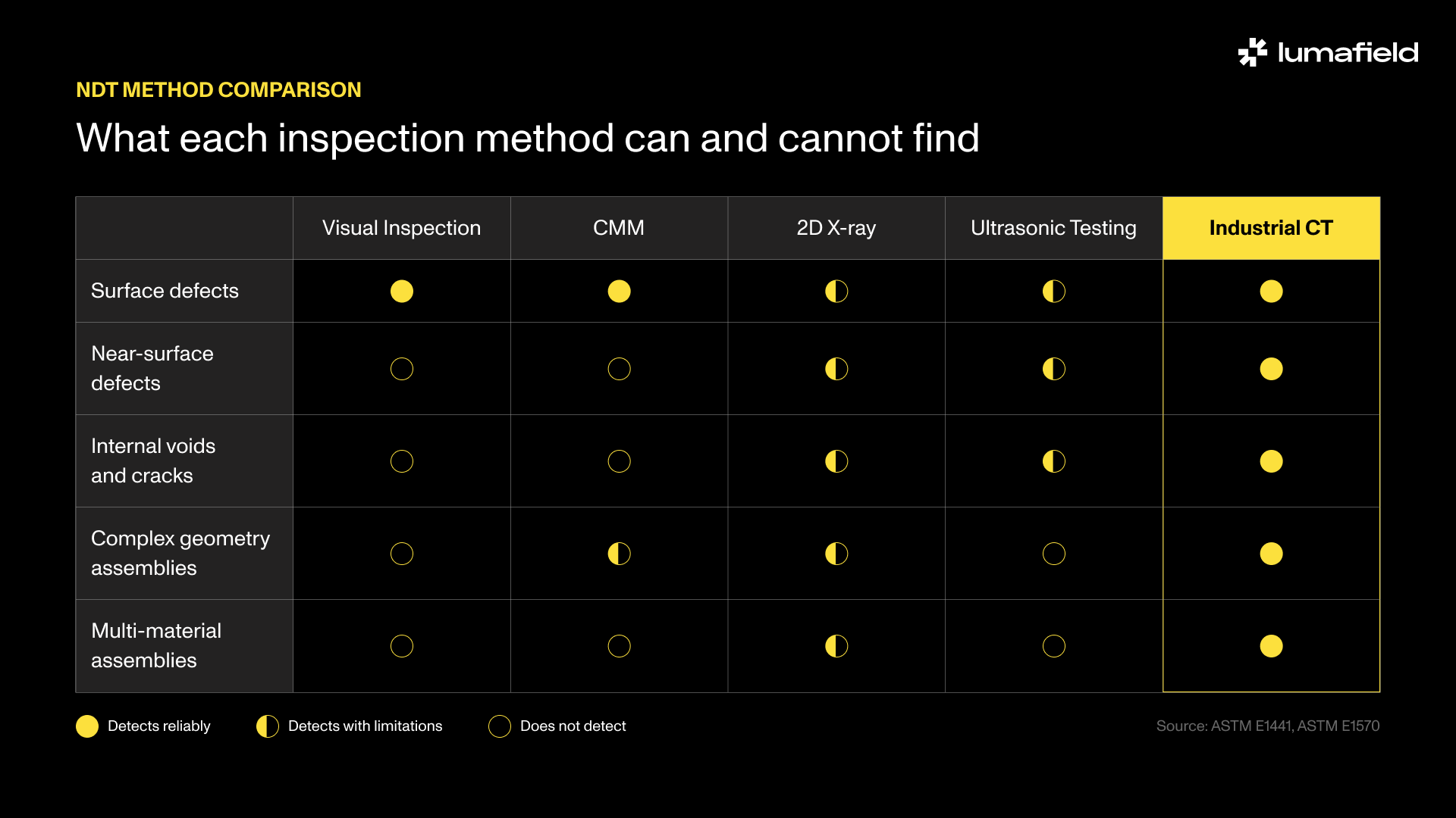 Industrial CT scanning is the inspection method ASTM codifies as capable of catching what other methods can’t. It’s the method that eliminates the inspection lag that turns defect trends into containment events, all while producing the quality record that customers with the highest standards require.