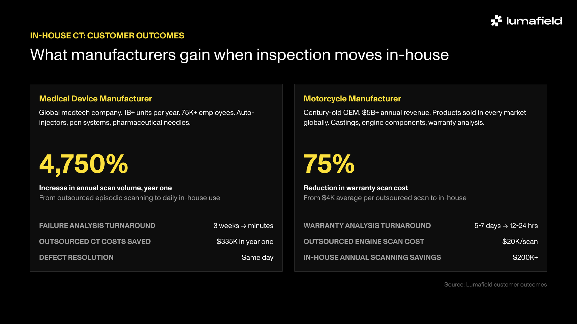 Outsourced CT runs roughly $519 per scan versus $141 to $285 per scan in-house at production utilization, based on peer-reviewed CT economics research. The per-scan advantage compounds with volume, and the latency advantage is separate: in-house inspection closes defect loops in hours rather than the five to seven business days typical of outsourced workflows. The break-even arrives faster than most operations leaders expect.