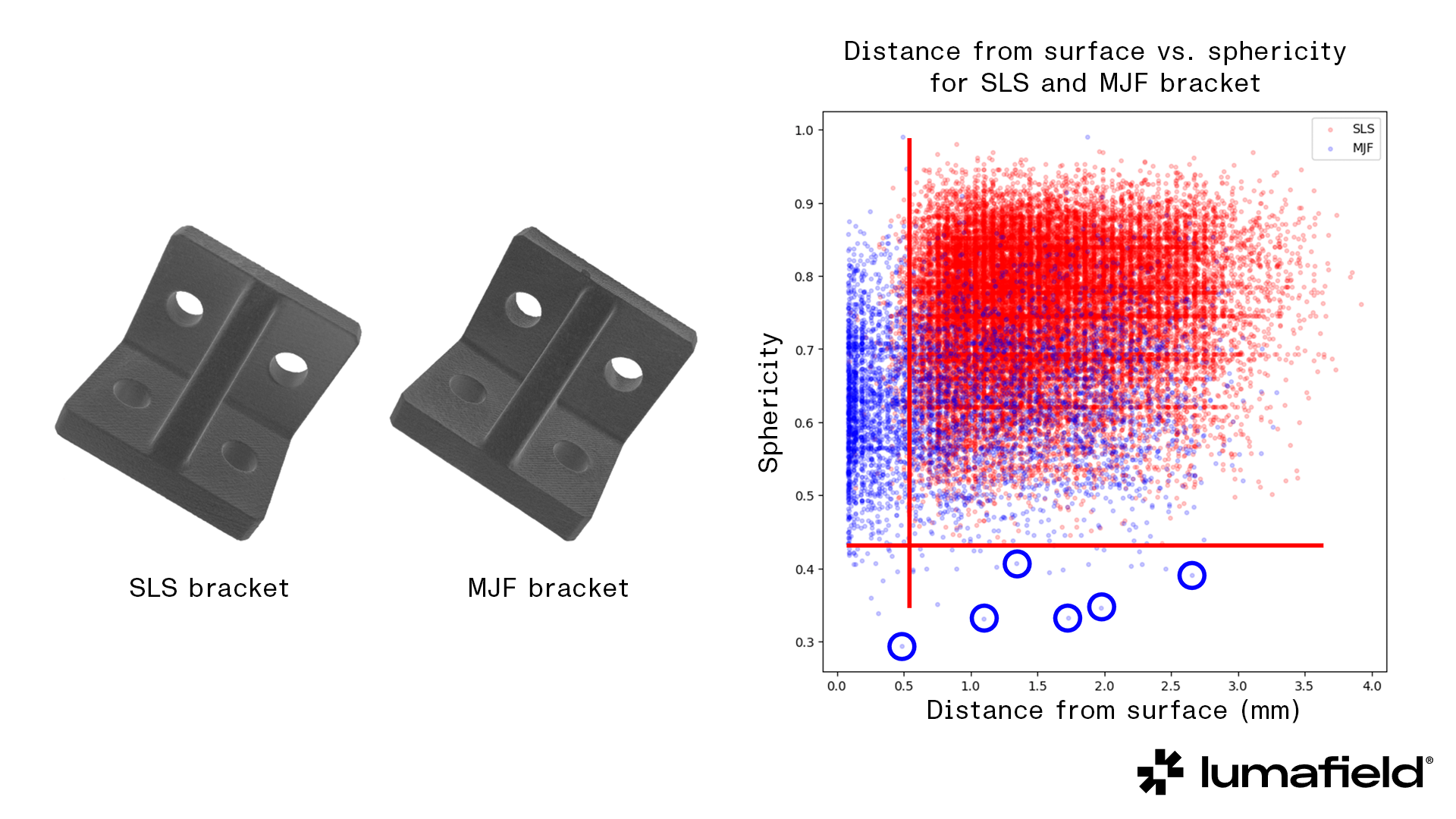 Though these two brackets, printed with different additive technologies, appear similar on the surface, CT scans combined with automated porosity analysis reveals dramatic differences in sphericity and distance from surface for internal voids.