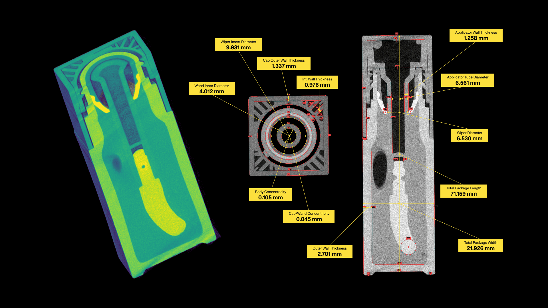 2D dimensioning works on any CT scan in Voyager. Pull a full-resolution slice from any location, mark the features you want to measure, and let the tool auto-detect lines, circles, peaks, and intersections. Manual refinement controls ensure each capture is exact. From those features, the full range of dimensional measurements can be extracted, giving engineers the evidence they need to make confident decisions about part quality. All results can be visualized and exported alongside the rest of your inspection data.