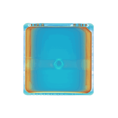 Near the center lies the UWB board containing Apple’s U2 chip. This module handles precise spatial awareness, sending and receiving short radio pulses to measure time-of-flight distances within centimeters. It underpins AirDrop directionality, Find My, and device handoff. The module’s design, visible in our scan, includes multiple shielded sections for noise isolation and a compact matching network for the antenna array.